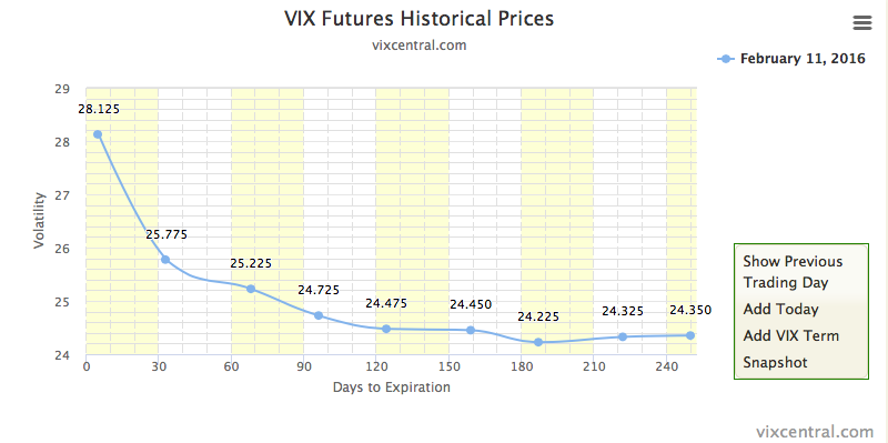 But tis not always thus. When markets get scared, the VIX shoots up, and so do the prices of the futures contracts. Typically the front months prices shoot up above the back (later) months, and the futures term structure takes on a negative slope (down to the right on the graph). Like a year ago February, 2016, when we’d been down all of January and things felt bleak. Take a look at VIX Central’s Historical Prices tab, dial it back to Feb 11, 2016 and…