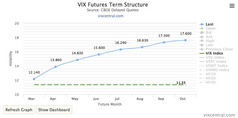 Every day, rebalancing the portfolio. Each day selling some and buying others — for XIV it’s mostly buying front month contracts to cover earlier sold contracts, and selling more second month contracts. but that isn’t strictly relevant here. What is relevant is that XIV sells contracts first, and then buys them back later. When you look at the term structure, you readily see that the curve is not just a snapshot of different futures contract prices… it’s also a vector path for the evolution of one futures contract through time. If the markets keep in this low volatility regime the rest of the year, that October contract will slowly lose value, and then as it becomes the third month, and the second month, and finally the front month contract it will be losing value daily, faster and faster. Right now the front month (March) contract is only five days away from expiration, and is selling for only $12.15 (eighty cents above the VIX) and dropping fast.